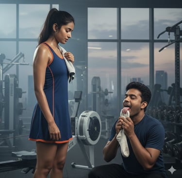 "Good. Ab chalo, mere saath," Pragati ne kaha. "Tumhari saza ka agla daur gym mein hoga."Pragati aur Abhi uske personal gym mein pahunche. Yeh koi normal gym nahi tha—yeh ek high-end, private facility thi, jahan sirf Pragati aur uske trainer aate the. Lekin aaj Abhi bhi wahan tha, woh corner mein khada tha, Pragati ke bag ko pakad kar, ek slave ki tarah.Pragati ne apna workout shuru kiya. Har set ke baad, woh ek break leti thi, aur har break par, woh Abhi ko apne paas bulati thi.