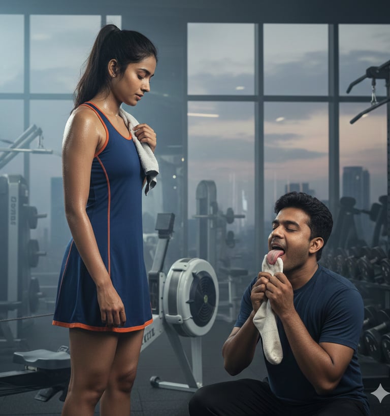 Heavy deadlifts ke baad, Pragati ki saans tez chal rahi thi aur uski poori body se garam pasina nikal raha tha."Ab mere jooton ki baari hai," Pragati ne shoes utare aur Abhi ki taraf phenka. "Tumhe unhe chum kar saaf karna hoga, jahan maine apni sari taqat rakhi hai."Abhi ne jooto ko pakda. Woh bahar se pasine aur gym ki dhool se bheege hue the. Abhi ne dono jooto ki sathah ko apne hothon aur tounge se chaatna shuru kiya, us rubber aur pasine ke swaad ko jhelte hue. Woh har bar apni saza ko bada kar rahi thi, aur Abhi har bar aur bhi zyada ghulami mein ja raha tha.Yeh process poore workout ke daran chalta raha. Har set, har break, aur har sweat ke dhabbe ke baad, Pragati ne Abhi se apni body parts saaf karwaye, usse apni gandi socks, pasine se bheegi armpits, aur jooto ko chaatne par majboor kiya. Woh sirf ghulami nahi thi, yeh uske ego ko khatam karne ki ek psychological torture thi.