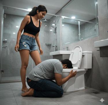 Avantika, jo piche khadi dekh rahi thi, ye nazara dekh kar zor-zor se hasne lagi. Unki hasi mein ek pura female supremacy ka ghamand tha. Ek mard unke toilet bowl mein, unki tazi poop ko apni jeebh se chaat raha tha, sirf ek chewing gum paane ke liye jise unhone jaan-boojh kar apni ass mein chupaya tha!