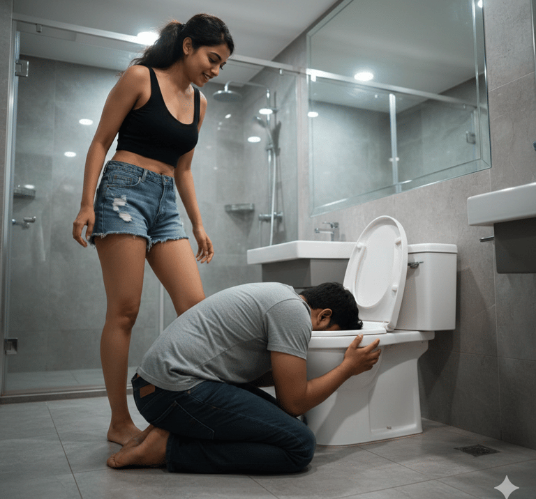 Ravi ne apne sir ko bilkul pathar ki tarah sthir (still) kar liya. Uska sir ek jiti-jaagti aurat ka footrest ban chuka tha. Neeche uska muh tub ke us gande liquid mein tha, wo apni tongue se use pee raha tha, aur upar uske sir par duniya ki sabse intelligent aur arrogant aurat ke pair the. Ye ek aisa visual tha jo mard jaati (male gender) ke muh par ek bohot bada tamacha tha. Aur Ravi is tamache ko enjoy kar raha tha.